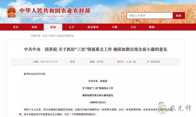2月5日,2020年中央一號文件正式出爐,題為《中共中央、國務院關于抓好“三農”領域重點工作確保如期實現全面小康的意見》。