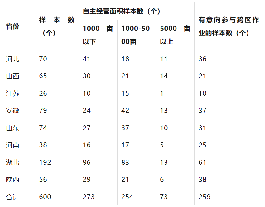 本次調查采取網絡問卷形式,共收到8個小麥主產省600個農機社會化服務組織的調查問卷,具體樣本分布情況如下表所示。