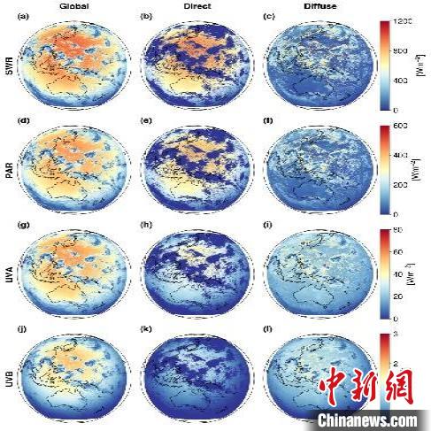 地表太陽輻射組分(短波輻射、光合有效輻射、紫外線A輻射、紫外線B輻射)的總輻射、直射及散射分量的空間分布。中國科學院空天院 供圖